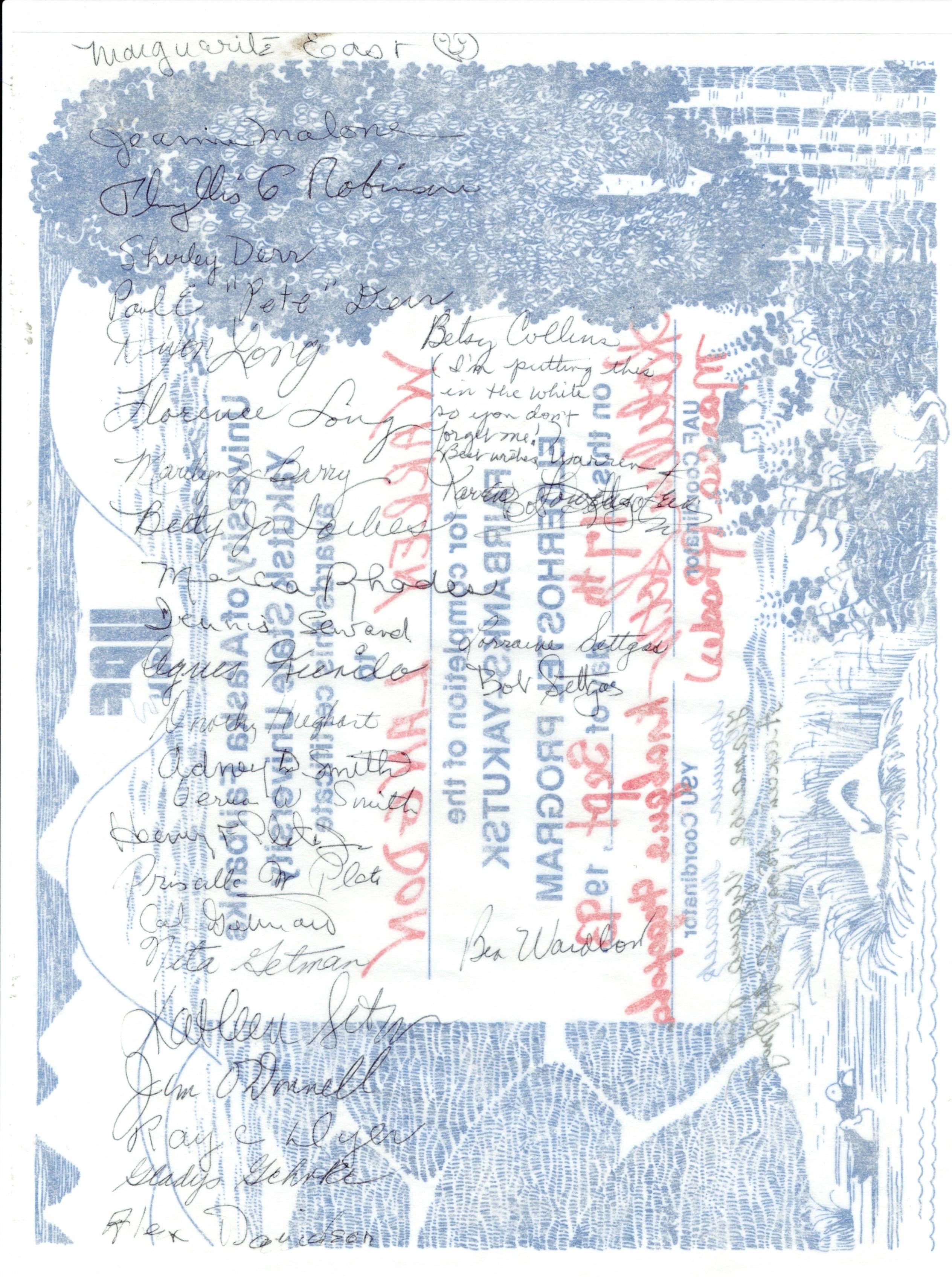 Most if not all of my father's Elderhostel courses included a certificate of completion, and his trip to Alaska and Siberia was no exception. Unlike most of them, however, the back of this certificate also contained important information: the signatures of the instructors and fellow participants. Unfortunately, the ink on the front side was heavy, and the paper was thin, so this is what my scan looked like. (Click on any image to enlarge it.)